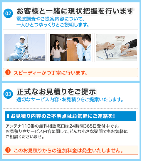 アンテナ設置・工事において気になることは現地スタッフへご相談ください。加盟店スタッフが電波調査をおこない、丁寧かつ分かりやすくお客様にご説明いたします。